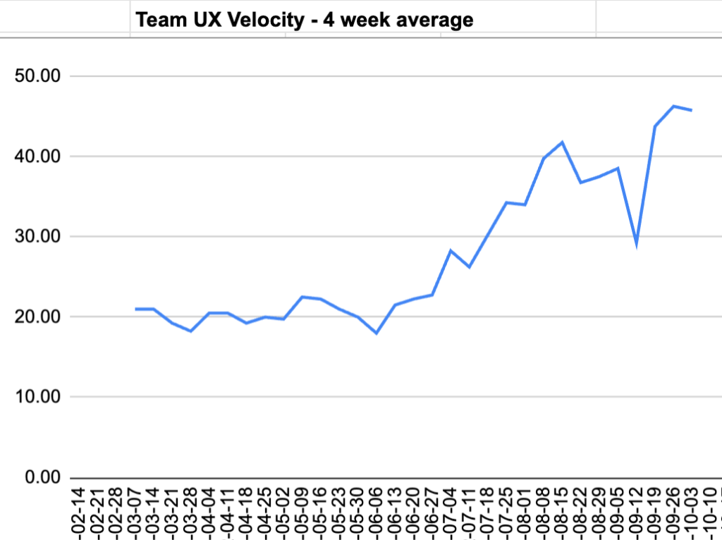 Every week during team lunch, I would pull up the team’s UX velocity and show it to the entire team. And use it to both stimulate discussion around team bottlenecks, and to challenge the team to scale new summits in the coming week.